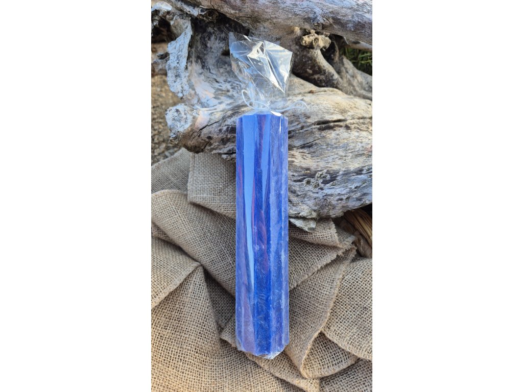 Tmavě modrá vysoká šesticípá svíčka z krystalického vosku (pro 6. čakru) – ideální pro meditace, rituály a harmonickou atmosféru. Poskytuje podporu při vyrovnávání energie a vnímání intuice.