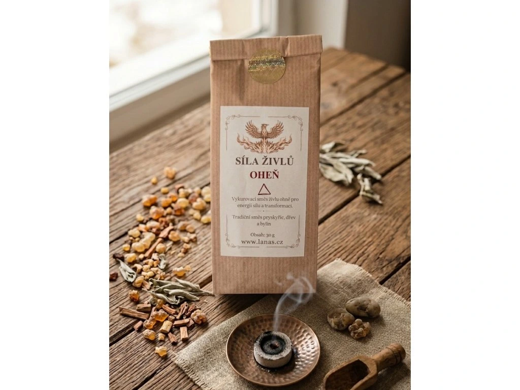 Přírodní vykuřovací směs inspirovaná živlem ohně. Dominantou je olibanum a jalovec doplněné o byliny spojené s ohněm, které vytváří výraznou, pryskyřičnou a lehce kořenitou vůni. Ideální pro vykuřování bytu, meditaci i rituály. Vhodná na uhlík i do kadidelnice.